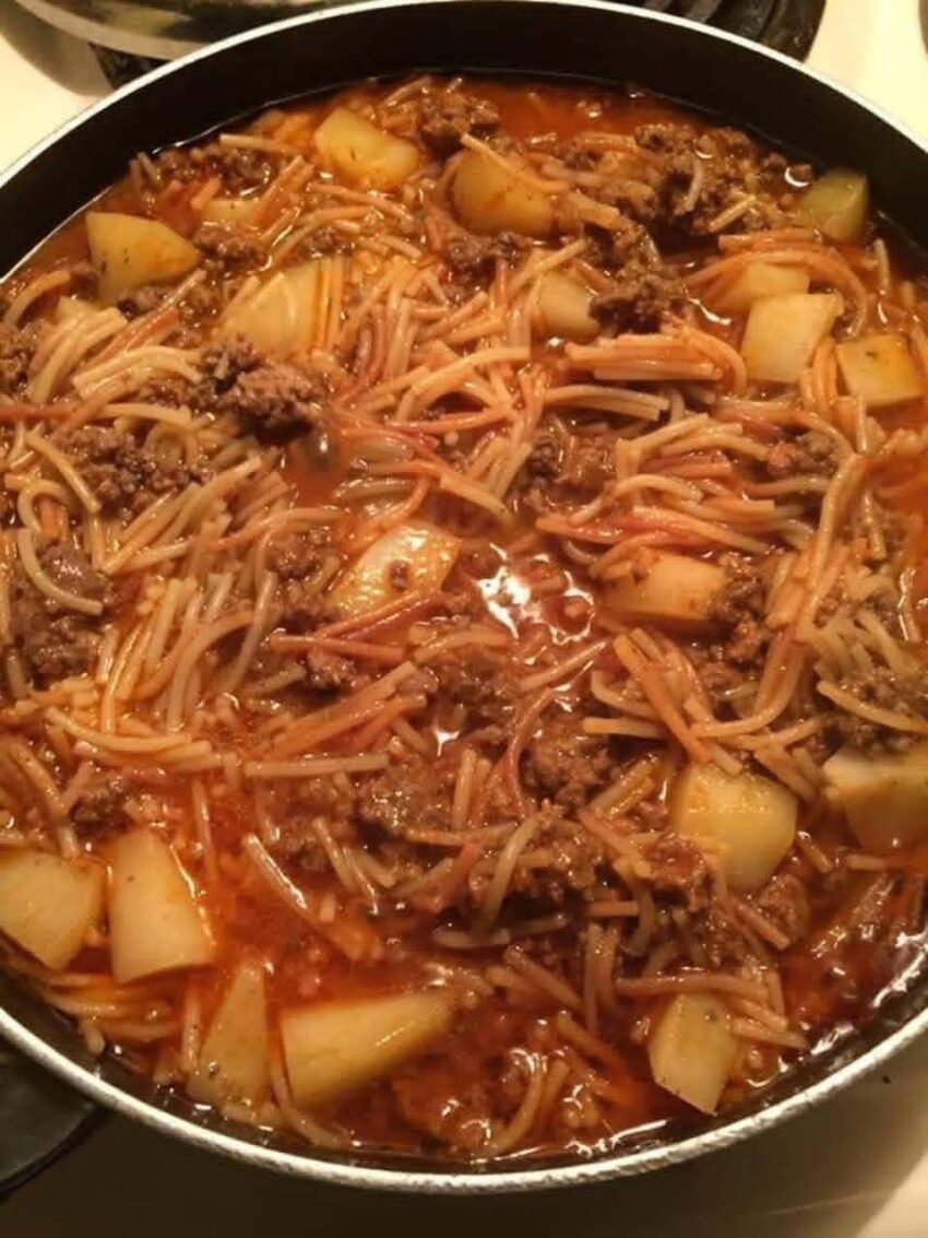 Ah! You’re talking about a dish with fideo, potatoes, and ground beef—sounds hearty and delicious. I can give you a simple recipe for it:
