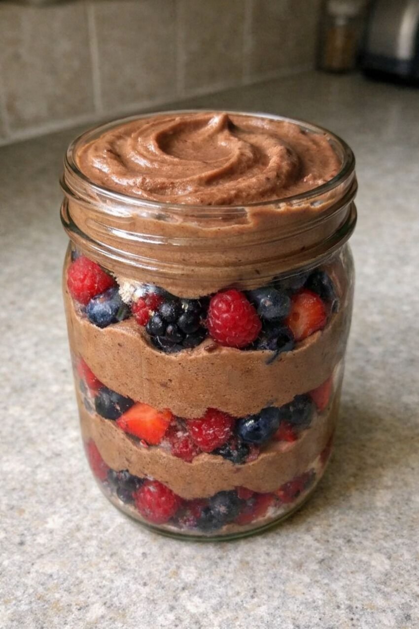 Here’s a High-Protein Chocolate Berry Protein Jar—a tasty, nutritious snack or breakfast you can make in minutes 🍫🍓🥣